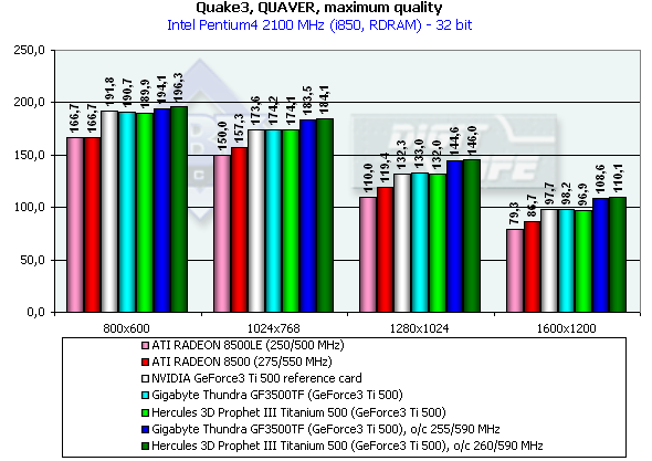 Hercules 3D Prophet III Titanium 500 продемонстрировала рекордный разгон ядра и памяти 260/295 (590) МГц. Это самый высокий подъем частот из всех наших наблюдений, поэтому потенциал очень впечатляет.
