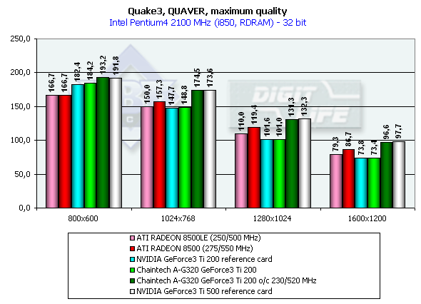 Этот тест нам показал, что Chaintech A-G320 GeForce3 Ti 200 находится примерно на одном уровне с ATI RADEON 8500LE и полностью идентична по производительности NVIDIA GeForce3 Ti 200 reference card. Как и следовало ожидать, значительный подъем частот при разгоне принес отличные дивиденды карте, сравняв ее с NVIDIA GeForce3 Ti 500.