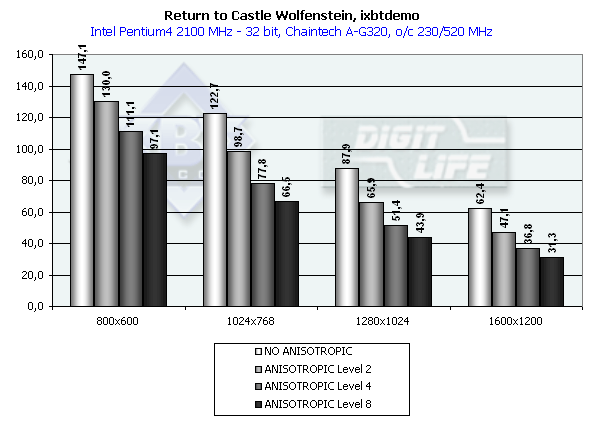 - Return to Castle Wolfenstein (id Software) игровой тест, демонстрирующий работу платы в OpenGL с использованием нами созданного и записанного демо-бенчмарка ixbtdemo.