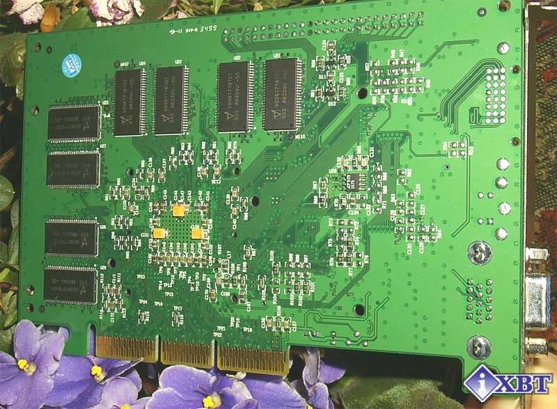 Что сразу бросается в глаза? То, что организация памяти осталась такой же, как и на Creative 3D Blaster Riva TNT2 Ultra — чипы те же самые, я даже сравнил маркировку микросхем. Я уже отмечал, что у современных видеоакселераторов самое узкое место — это полоса пропускания шины памяти. Иначе говоря, сколько бутылку не делай шире и больше, при том же самом горлышке, выльется из нее за единицу времени столько же воды, сколько и при гораздо меньшем объеме сосуда. Это уже первый повод для некоторого разочарования. Зачем делать чипсет более мощным, если все равно память не будет успевать за ним? Печальная участь 32-битного цвета так и осталась печальной, ведь, прежде всего из-за недостаточной скорости обмена с памятью мы видим более скромную производительность видеоускорителей при такой глубине представления цвета.