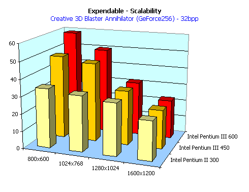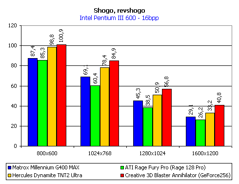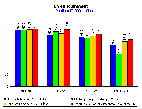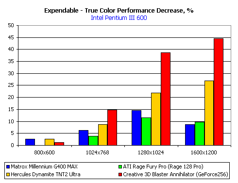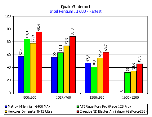 Видно, что NVIDIA GeForce 256 обгоняет соперников только на высоких разрешениях. Судя по всему, ограничением является вычислительная мощность центрального процессора системы, даже в случае с Pentium III 600 МГц. Отметим обгон нашего героя другой новой картой — ATI RAGE FURY PRO в ряде разрешений.