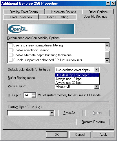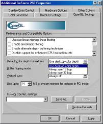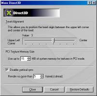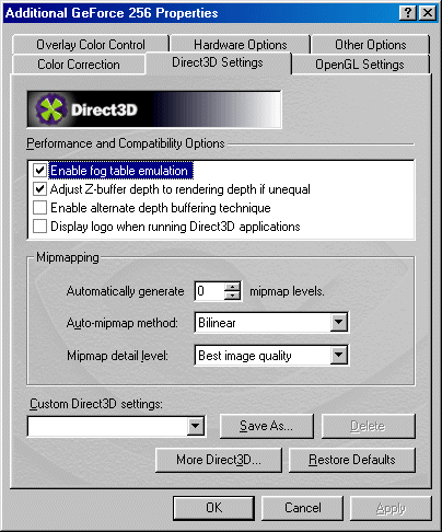 Эта закладка посвящена настройке Direct3D. По умолчанию включены опции эмуляции табличного тумана и Z-буфера. Лавры 3dfx, показывающей свой логотип при инициализации Glide, видимо, не дают покоя NVIDIA, которая решила вставить опцию показа ее логотипа при работе с Direct3D-программами. Остальные настройки драйверов мало чем отличаются от 2.* драйверов, за исключением замены опции трилинейной фильтрации на 8-точечную анизотропную в разделе MIP-mapping.