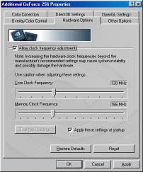 Здесь я хочу немного отклониться от темы и пару слов сказать о разгоне. Дело в том, что мы, как уже стало у нас правилом, испытываем карты не только на штатных частотах, но и в режиме разогна. К сожалению, NVIDIA GeForce 256 является чрезмерно греющимся чипсетом, поэтому возможности его разгона весьма скромны. Нам удалось добиться стабильной работы карты при наличии внешнего дополнительного охлаждения только лишь на частотах 135/185 МГц (первое значение — частота чипсета, второе — памяти).