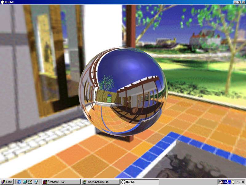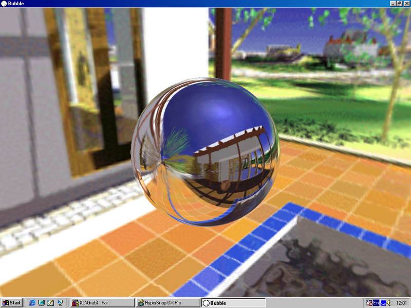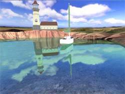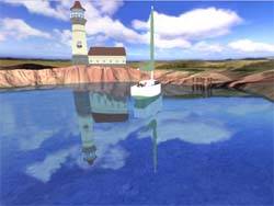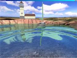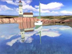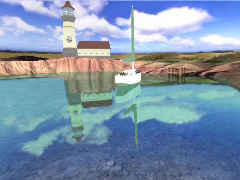 Теперь о воде :). Да, этот объект в 3D-мире волнует многих проектировщиков, прежде всего из-за своей динамичности. Вода, в отличие от, например, стен, постоянно изменяется. Matrox предлагает использовать метод EMBM (рельефное текстурирование с использованием карт окружающей среды) для придания реалистичности движению воды. Согласен, этот способ действительно уникален и обеспечивает должный эффект. Однако, к сожалению, этой технологией владеют только чипсеты Matrox G400, поэтому разработчики не спешат с воплощением EMBM в играх. А есть ли способ повысить реалистичность отображения воды без особых технологий? Да есть, однако требуются достаточно большие вычислительные способности процессора. Вот тут и приходит снова на выручку наличие геометрического сопроцессора. Ниже представлены три скриншота, которые демонстрируют качество моделирования водной поверхности при наложении различных эффектов, воплощающих отражения и полупрозрачность: