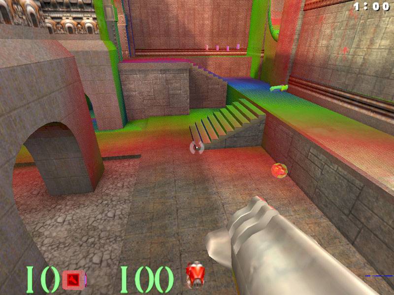 Следующей особенностью NVIDIA GeForce256 является наличие 4-х конвейеров (напомню, что у NVIDIA Riva TNT/TNT2 их два). Это означает, что за каждый такт может формироваться четыре пикселя одновременно. При заявленной тактовой частоте GPU в 120 Мгц, мы получаем величину fillrate (скорость заполнения сцены) в 480 млн. пикселей в секунду. Однако, каждый конвейер у GeForce 256 имеет по одному блоку текстурирования. То есть, что в приложениях, использующих технику мультитекстурирования, когда на один пиксель накладывается одновременно две текстуры, величина fillrate при той же тактовой частоте чипа в 120 МГц снизится до уровня в 240 млн. пикселей в секунду. Отметим, что текстуры накладываются уже отфильтрованными, при этом для формирования одного текселя используется 8 текстурных сэмплов, что обеспечивает бесплатную анизотропную фильтрацию. Анизотропная фильтрация на основе 8 текстурных сэмплов — несколько своеобразное решение, слишком уж мало сэмплов. Лучшие результаты от использования анизотропной фильтрации получаются все-таки при использовании 16 или даже 32 текстурных сэмплов для определения результирующего цвета текстуры. Почему NVIDIA использует лишь 8 семплов, а не больше? Потому что для такой реализации нужен всего один блок текстурирования, как и реализовано в GeForce 256. Тем не менее, при использовании даже 8 сэмплов качество выводимого на экран монитора изображения существенно улучшается. Есть все основания предполагать, что будет заметно и улучшение качества картинки даже в существующих играх. Это было подтверждено на примере Quake3 (для наглядности я включил раскрашивание MIP-уровней разными цветами). Напомню, что техника MIP-mapping существует для того, чтобы объекты, находящиеся на разном расстоянии от глаза наблюдателя, отображались с разной степенью детализации (ведь чем дальше от нас объект, тем более расплывчато мы его видим). Поэтому вся сцена разбивается на на MIP-уровни, границы между которыми надо сглаживать, иначе реалистичность 3D-сцены снизится. Для этого существует ряд техник фильтрации, которым мы уделим особое внимание.
