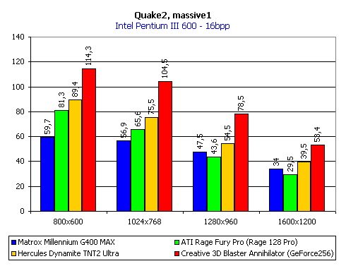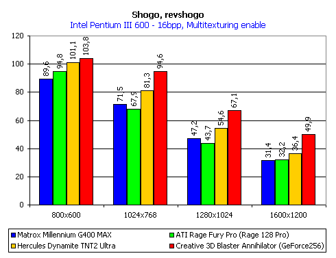 Здесь мы наблюдаем привычную картину, когда карта на базе NVIDIA GeForce 256 при более высоких разрешениях значительно обходит конкурентов. Примечательно то, что ATI RAGE 128 PRO как раз здесь показала самые худшие результаты, что тоже странно.