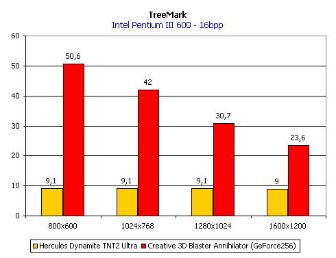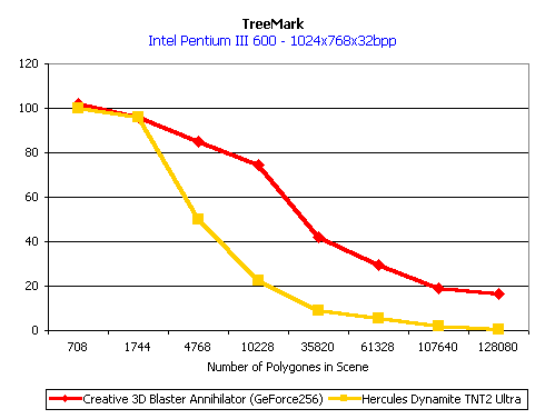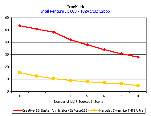 Теперь мы займемся 3D-графикой, прежде всего скоростными показателями. На этот раз мы немного отошли от традиции и добавили ряд новых показателей. Прежде всего, начнем мы с бенчмарка, который с некоторых пор стал олицетворением NVIDIA GeForce 256, а именно NVIDIA TreeMark. Именно этот демо-тест расчитан на все возможности этого чипсета и демонстрирует работу видеоакселератора в весьма напряженных условиях (при многих источниках освещения, а также большом количестве полигонов). Эта программа использует интерфейс OpenGL.