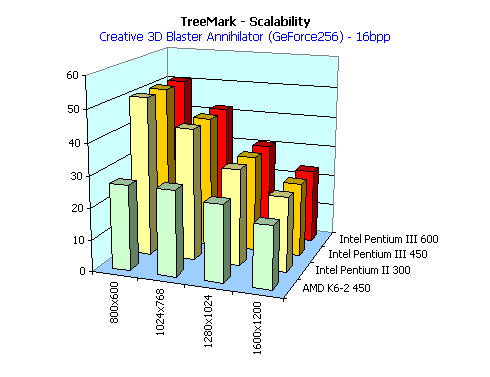 Мы специально привели эту диаграмму наряду с аналогичными результатами и по тесту TreeMark, использующему возможности GPU, для того, чтобы показать, что карта на базе NVIDIA GeForce 256 при работе с играми, которые не используют возможности геометрического сопроцессора демонстрирует снижение производительности при уменьшении частоты CPU системы, в такой же пропорции, что и ее предшественник — карта на базе NVIDIA Riva TNT2 Ultra.
