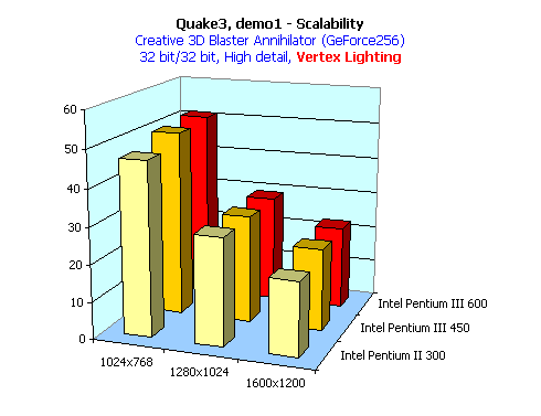 Как было ранее сказано, id Software создает игру Quake3 так, что даже без переделки часть функций по обсчету геометрии и освещения можно возложить на геометрический сопроцессор. В частности, расчет вершинного освещения. Quake3 поддерживает два типа освещенности: при помощи карт освещения (lightmap) и вершинное (вертексное). Последнее, хотя и реализовано довольно убого в Quake3, можно возложить на GPU, а не на центральный процессор. Из диаграммы выше нетрудно заметить, что падение скорости при снижении частоты процессора не столь стремительно, как если бы это была игра, совершенно не пользующаяся преимуществами T&L.