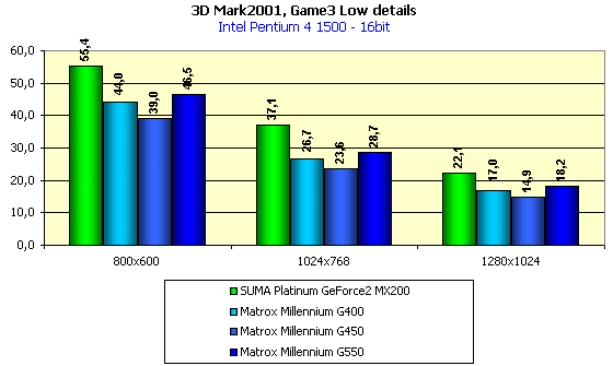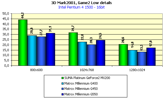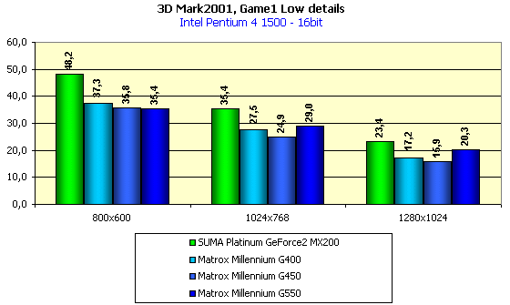 - MadOnion 3DMark2001 Pro — синтетический тест, демонстрирующий работу в DirectX 8.0 с использованием игровых тестов Game1, Game2, Game3 при низкой детализации.