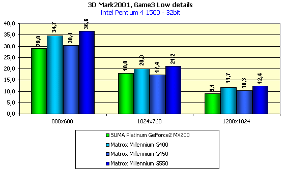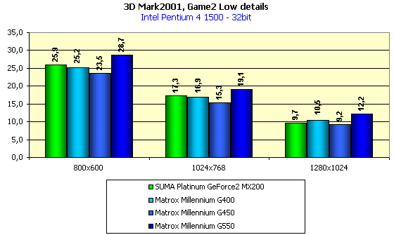 Мы видим, что картина чуть лучше, нежели в Quake3; Matrox Millennium G550 уже подчас обгоняет GeForce2 MX200 в 32-битном цвете (все же наличие DDR-памяти сказывается при равных с MX200 64-битных шинах). Тем не менее, превосходство минимально, и поэтому G550 можно смело относить по производительности к классу MX200/TNT2Pro/G400. То, что у G550 есть Hardware T&L, ни одна программа не видит (Matrox так хорошо "запрятала" этот блок :-), не обеспечив ему совершенно никакой поддержки в текущей версии драйверов).