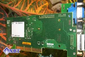 Вернемся к Matrox Millennium G550. Что сразу бросается в глаза? Небольшой размер PCB да традиционный для Matrox черный игольчатый радиатор без вентилятора, под которым можно найти и сам GPU (официально чип можно так называть, однако рука не поднимается писать этот термин для обозначения процессора, имеющего Hardware TCL "для галочки").