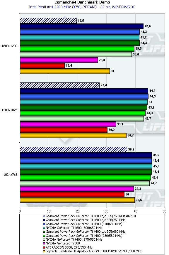 Мы видим, что "упирание" этого теста в частоту CPU налицо, поскольку даже падение производительности у GeForce4 Ti 4600 при активной анизотропии максимально возможной степени (обратите внимание на то, что мы снимали эти тесты на разогнанной карте) намного меньше, чем в других тестах. Расклад борьбы между Ti 500, RADEON 8500 остался на том же уровне, а вот GeForce4 Ti 4400 тут уже была побыстрее, чем разогнанный 128-мегабайтный RADEON 8500 (все же влияние двойного блока вершинных шейдеров сказывается, а Comanche4 активно использует эту технику).