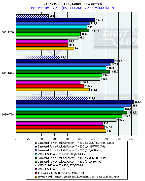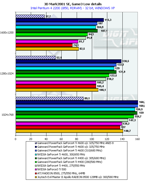 Что мы можем тут видеть? А то, что разогнанный 128-мегабайтный RADEON 8500 почти догнал GeForce4 Ti 4400! Мы являемся еще раз свидетелями феномена карты на базе GPU от ATI, причиной которого может быть как отвратительная работа с AGP у 64-мегабайтных карт, так и влияние контроллера памяти, который оказался очень отзывчивым на увеличение объема памяти (кстати, у карты Joytech Apollo Devil Monster II RADEON 8500 имеется 8 32-битных модулей памяти, что позволило бы иметь 256-битную шину, если бы позволяла разводка карты и сам чип). Подчеркну, что разгон карты от Joytech нам позволил примерно оценить возможности так и не вышедшего RADEON 8500XT.