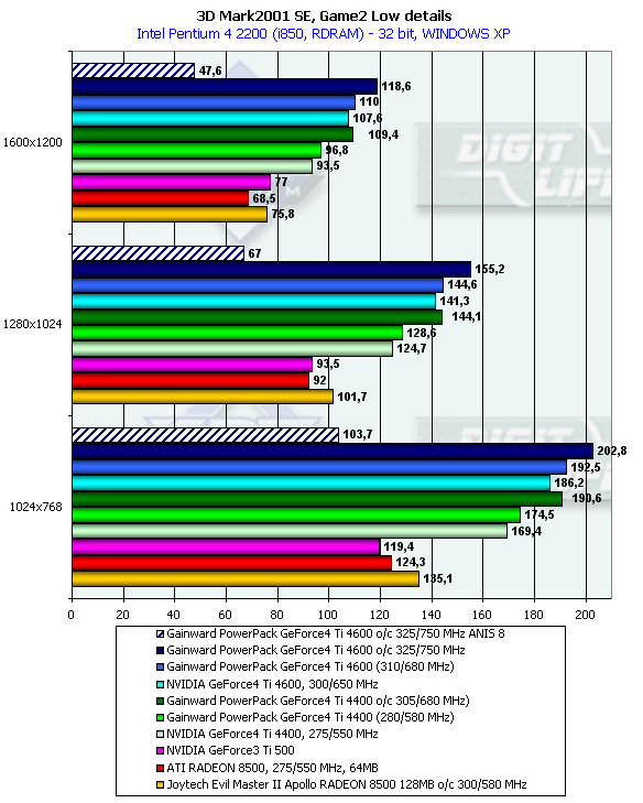 Как мы видим, вся драма разворачивается не вокруг GeForce4 Ti 4400/4600, а между GeForce3 Ti 500, RADEON 8500 64MB и RADEON 8500 128MB. Последняя просто "уделала" своих конкурентов. А в "стане" исследуемых в этой статье карт все как положено: производительность у карт от Gainward несколько выше, чем у эталонных карт, что ожидаемо, так как частоты у первых выше. Большой "ложкой дегтя" выглядит скорость при активной анизотропии, мы нарочно будем каждый раз об этом напоминать, чтобы фирма NVIDIA наконец-то устыдилась такого позора у своего маститого детища.