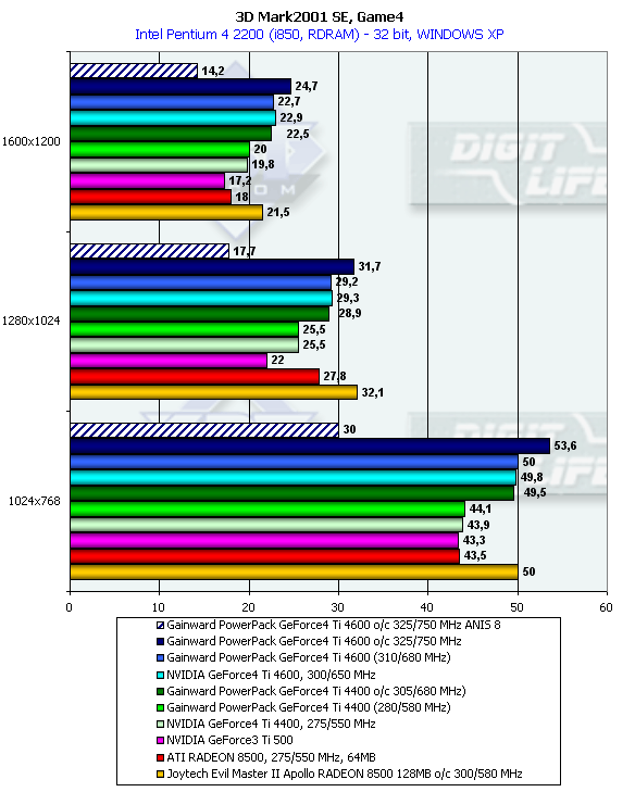 Так и хочется сказать: "Замечательно!" Только не в отношении GeForce4 Ti, а в адрес все той же карты от Joytech. Это ж надо, разгон этого продукта позволил ей догнать в Game4 даже разогнанный GeForce4 Ti 4600! Пусть даже и в одном единственном разрешении. А в остальных карта смело спорит с супер-ускорителями от NVIDIA и находится на равных.. Прямо снова обзор 128-мегабайтного RADEON 8500 получился :-). На самом деле, как уже достоверно известно, этот тест весьма подвержен влиянию таких факторов как отлаженность драйверов, платформа. "Заточить" работу карт "под Game4" возможно. В форуме madonion.com даже сами разработчики в этом признавались. Можно только похвалить программистов ATI, что они вовремя подсуетились и сделали это (мы помним печальные результаты в Game4 на первых версиях драйверов под RADEON 8500).