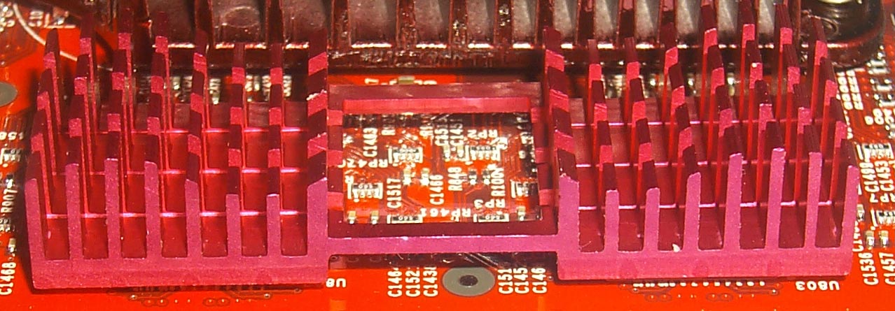 Первое, что бросается в глаза, это наличие радиаторов на памяти. На передней стороне установлены более высокие радиаторы, чем на задней. К тому же "передние" радиаторы охлаждаются еще и потоками воздуха из центрального радиатора, а вот "задние" ничем (если только в корпусе системного блока не установлена продувка).