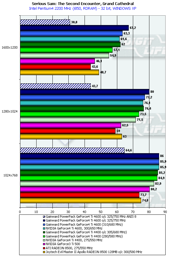 Я не стал тестировать в разрешениях старше 1024х768, поскольку и так ясно, что играбельность тут на пределе даже у самого мощного акселератора на сегодня — NVIDIA GeForce4 Ti 4600.