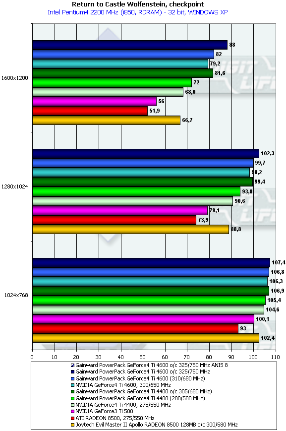 - Return to Castle Wolfenstein (MultiPlayer) (id Software/Activision) — OpenGL, мультитекстурирование, Checkpoint-demo, настройки тестирования — все на максимально возможном уровне, S3TC OFF, конфигурации можно скачать тут;