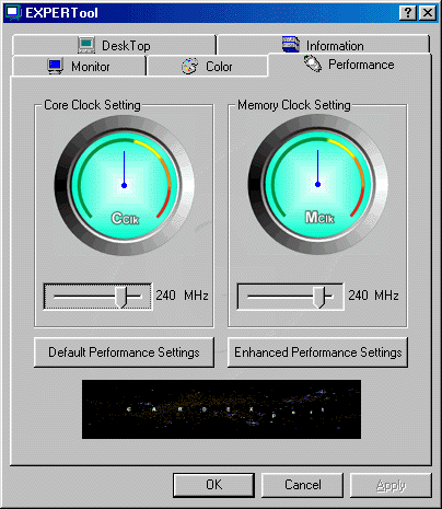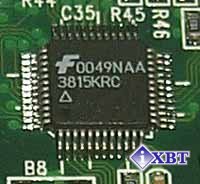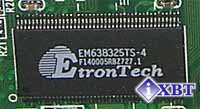 Микросхемы памяти марки EtronTech, время выборки — 4 ns (!!), что соответствует 250 МГц. Что касается частот работы карты, то тут ситуация интересная. Дело в том, что плата имеет два режима работы: стандартный и экстремальный (по аналогии с Turbo режимом, который в свое время ввела фирма Gigabyte). Но переключаются эти режимы только программным путем при помощи соответствующей утилиты, поставляемой с видеокартой. Стандартный режим предусматривает частоты 200/166 МГц и мало интересен широкому кругу пользователей. А вот экстремальный режим включает частоты 240/240 МГц! Замечу, что это не разгон, а один из штатных режимов работы Golden Sample! Как можно заметить, если память работает на частоте немного ниже номинала согласно времени выборки, то GPU явно сильно переразогнан, отсюда можно сделать вывод, что для комплектации подобных плат производится отбирание чипов.