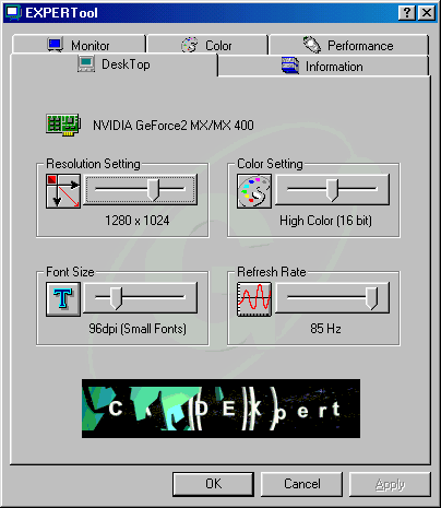 С видеокартой поставляются драйверы от NVIDIA версии 12.00, а также утилита по настройкам — EXPERTool версии 2.73, которая позволяет: