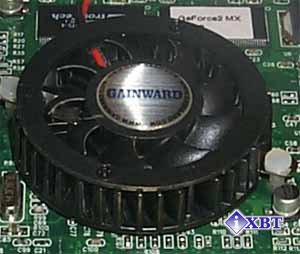 Охлаждающие устройства округлой формы уже стали довольно привычным явлением у видеокарт. Для обеспечения необходимого температурного режима GPU компания Gainward использует уже знакомый по картам от ASUSTeK кулер очень эффективного действия. Можно еще отметить весьма стильную объемную наклейку на нем. Под кулером находится сам графический процессор NVIDIA GeForce2 MX400.