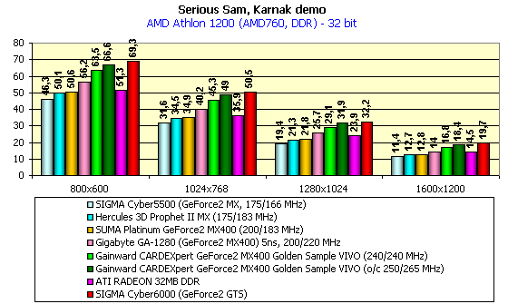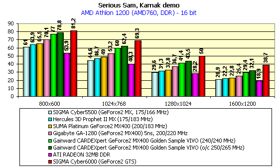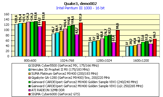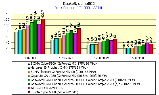 Для сравнительного анализа были использованы показания с видеокарт SIGMA Cyber6000 (GeForce2 GTS), SIGMA Cyber5500 (GeForce2 MX), SUMA Platinum GeForce2 MX400, Hercules 3D Prophet II MX, Gigabyte GA-GF1280 MX400 5ns SDRAM, ATI RADEON 32MB DDR.