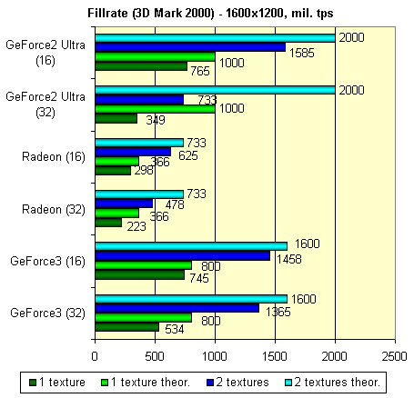 Наименее сбалансированной архитектурой оказался GPU GeForce2 Ultra, наиболее сбалансированными являются GPU RADEON и GeForce3, с попеременным успехом. Именно величины их fillrate наиболее близки к теоретическим значениям, а, следовательно, сильнее раскрывают потенциал своей тактовой частоты и числа конвейеров.
