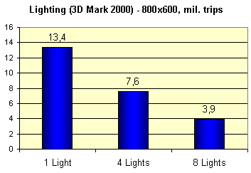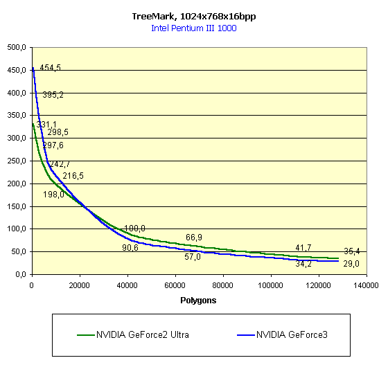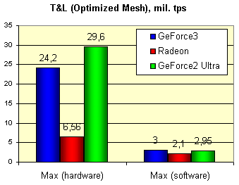 Грубо говоря, HW T&L у GeForce2 Ultra снова впереди, а вот малое число полигонов, наоборот, дает