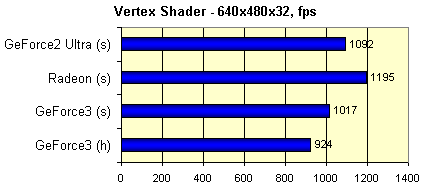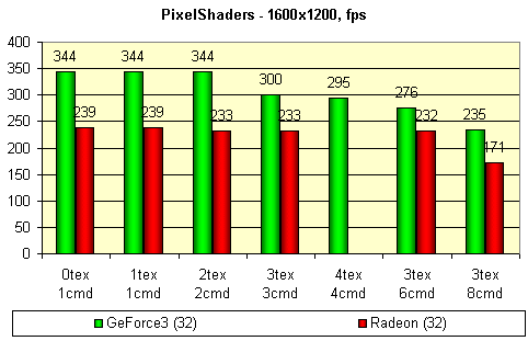 Для сравнения приведены результаты, полученные на RADEON. Тест проводился в режиме 1600x1200@32, дабы максимально снизить зависимость результатов от параметров, связанных с геометрическими преобразованиями. Внизу приведены кодовые обозначения шейдеров в виде Xtex Ycmd — где X количество одновременно используемых текстур, а Y — длина шейдера в стадиях конвейера.