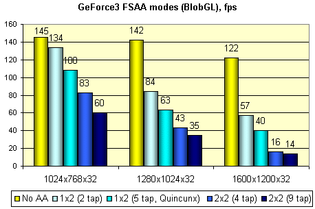 А этот тест (на основе несложного скринсэйвера) позволяет проследить падение производительности GeForce3 в различных принудительных режимах MSAA, описанных нами ранее и выбираемых в панели настроек драйвера: