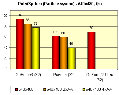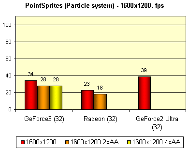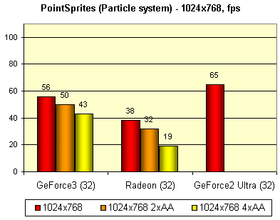 На подобном незатейливом тесте карта на базе GeForce3 проигрывает GeForce2 Ultra строго в соответствии