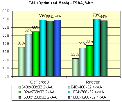 растеризация оказывается сдерживающим фактором для HW T&L. Приведем величину падения производительности
