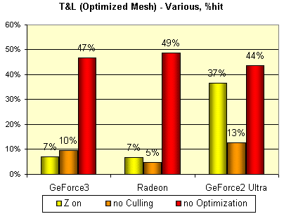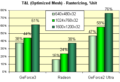 Полученные результаты говорят о том, что по сравнению с GeForce2 Ultra работа RADEON и GeForce3 c Z буфером организована чрезвычайно эффективно. И, что самое главное, вероятно, они используют схожие технологии сжатия Z — величина падения производительности совершенно идентична. Наиболее эффективное (с точки зрения оптимизированной модели) кэширование имеют RADEON и GeForce3, а GeForce2 Ultra вновь аутсайдер. От технологии HSR в данном тесте зависело немного, но все равно, сознательно внесенные обратные грани меньше всего ударили по RADEON. Позднее мы попробуем найти более весомое подтверждение гипотезе о высокой эффективности реализованного в GeForce3 метода HSR.
