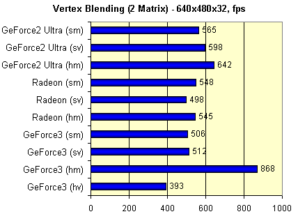 Здесь (hm) обозначает аппаратный двухматричный блендинг, (hv) эквивалентный вершинный шейдер, а (sm) и (sv) их программную эмуляцию соответственно. Цифры удивительно близки, но как бы там ни было, следует отметить, что в случае программной эмуляции выгоднее вершинный шейдер, а в случае аппаратного исполнения — простой матричный блендинг. Здесь GeForce3 существенно производительнее чипов предыдущих поколений. Очевидно, что для получения наибольшей отдачи программистам необходимо комбинировать аппаратный матричный блендинг и шейдеры (для прочих геометрических нужд), исполняя их на аппаратном уровне.