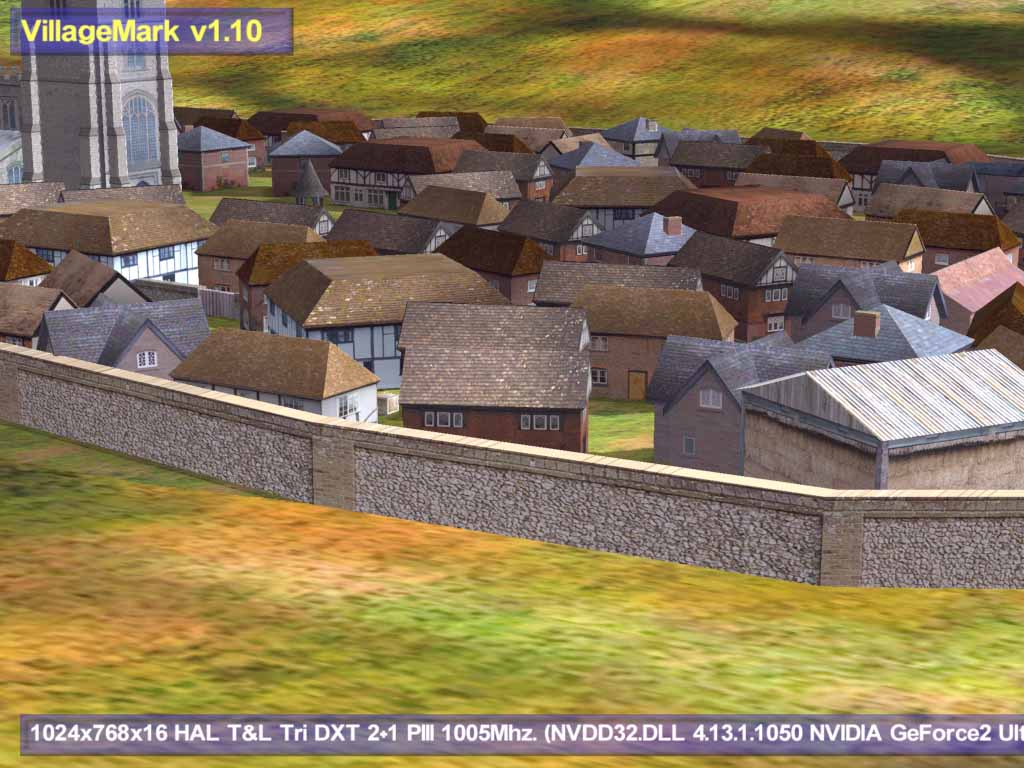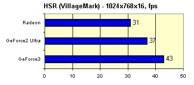 Как видно, в разрешении 1024x768 мы вольны выбирать любые методы сглаживания, режим 1280x1024 оставляет нам метод 1x2 и Quincunx, а в 1600x1200 лучше использовать "как есть". Эта картина очень характерна для GeForce3, но об этом чуть позднее, при обсуждении результатов реальных игровых тестов. И, напоследок, хорошо известный тест эффективности HSR, VillageMark (сцена с огромным значением overdraw):