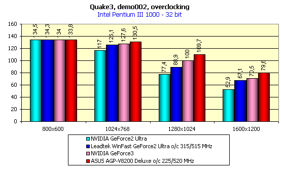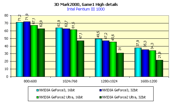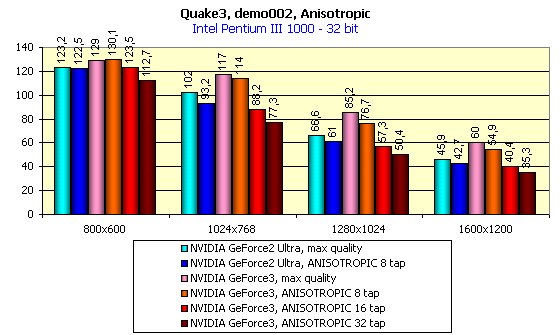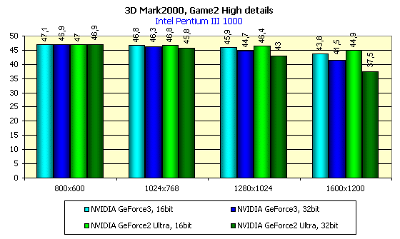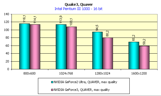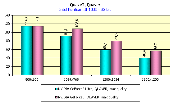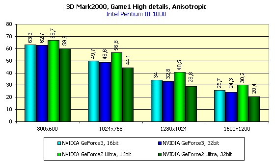 Видно, что в 16-битном цвете GeForce3 незначительно опережает GeForce2 Ultra, а вот в 32-битном цвете это преимущество становится очевидным и осязаемым.