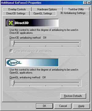 В драйверах версии 10.50 настройка эффекта сглаживания (анти-алиасинг, АА) вынесена в отдельную закладку, объединяя в одном месте регулировки АА для Direct3D и OpenGL приложений. Возможности настроек для обоих API полностью идентичны. Напомню, что NVIDIA GeForce3 использует новый метод мультисэмплинга для реализации АА, о котором было рассказано выше. Мы можем использовать следующие режимы АА:
