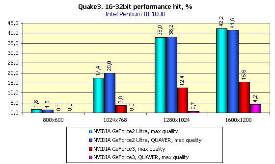 первенство GeForce3. Теперь оценим в целом величину падения производительности при переходе с 16-