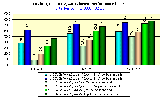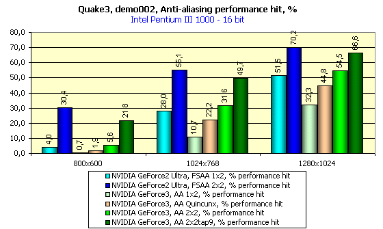 Мы помним, что по качеству анти-алиасинг у GeForce3 в режиме Quincunx (розовый столбец) примерно соответствует и даже превосходит режим 2х2 SSAA у GeForce2 Ultra (синий столбец на диаграмме). Даже в относительных единицах видно, что SSAA проигрывает везде. Конечно, MSAA далеко не бесплатный, как обещалось в рекламных материалах, однако при мощи GeForce3 он дает отличные результаты по производительности.