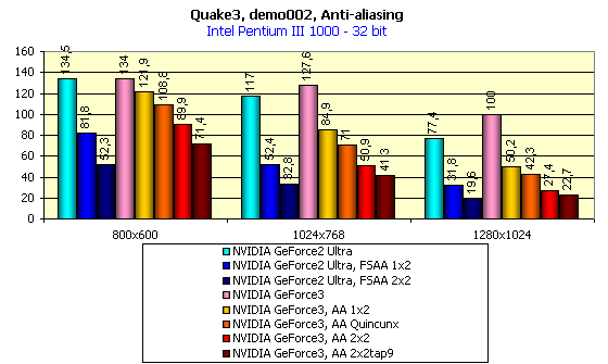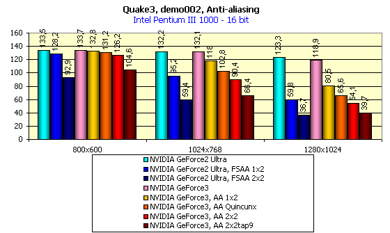 У GeForce3 просто блестящие результаты, не правда ли? Конечно, скептики сразу же возразят, что, мол, за счет более низкой скорости в 16-битном цвете и получилась такая небольшая разница в производительности. А нужно ли вообще использовать 16-битный цвет с картами на базе GeForce3? Может быть, пора вообще забыть о нем, как о тяжелом сне? Видеокарты класса GeForce3 (да и GeForce2 Ultra) могут обеспечить отличные результаты и в "труколоре". Если же у вас монитор не поддерживает высокие разрешения (вроде 1600х1200), то мы советуем вам обратить внимание на такую вещь, как анти-алиасинг.