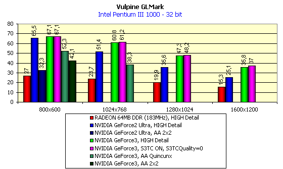 - NVIDIA GeForce3 продемонстрировала блестящее качество, а вот производительность не на столь высоком уровне, впрочем, как и у всех остальных рассмотренных нами карт. Безусловно, GeForce3 — это однозначный лидер, на видеокартах такого уровня можно играть в игры с очень высокой сложностью сцен при хорошей играбельности в популярных разрешениях.