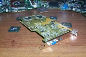 Под радиатором можно найти и "виновника торжества" — GPU GeForce4 MX 440. На платах ранних выпусков он пока еще маркируется согласно кодовому имени — NV17.