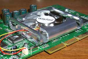 Вернемся к рассмотрению кулера. Вы наверное обратили внимание на то, что с выходом каждого нового продукта компания Leadtek проводит эксперименты по внедрению новых форм охлаждающих устройств. Вот и теперь мы являемся свидетелями необычной конфигурации кулера: