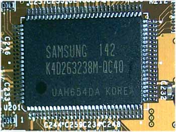 Как видим, на плате установлена уже очень хорошо нам знакомая 4ns память производства Samsung, а фактическая частота работы памяти составляет 200 (400) МГц. Но вот чип у данной карты работает на чуть более высокой частоте — 275 (а не 270) МГц.