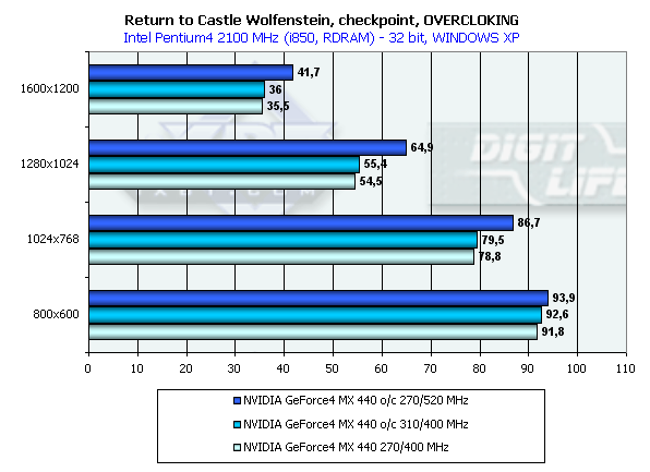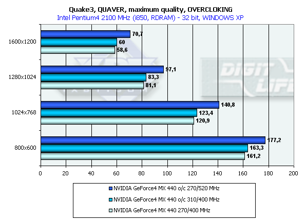 Результат теста с оверклокингом свидетельствует о том, что разгон памяти у таких карт является приоритетным, тогда как подъем частоты ядра практически ничего не дает. Поэтому, как и в случае GeForce2 MX, при выборе карты надо обращать прежде всего внимание на то, какой памятью плата комплектуется.