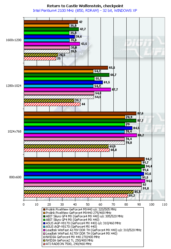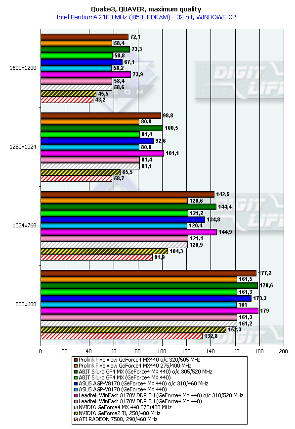 Картина полностью аналогичная за исключением разве лишь того, что RADEON 7500 иногда опережает карту на базе GeForce2 Ti. А GeForce4 MX 440 как лидером был, так и остался.