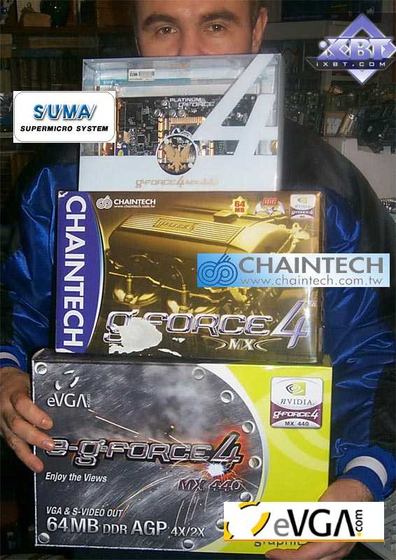 - Chaintech A-G440 GeForce4 MX 440 примечательна нашим читателям прежде всего тем, что имеет почти самую низкую цену из всех ныне представленных на рынке карт на базе MX 440, а Chaintech A-G441 GeForce4 MX 440 SE подойдет в качестве отличного подарка для жаждущих апгрейда :-).