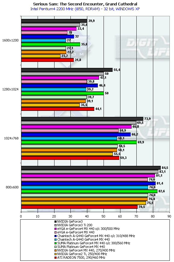 - Serious Sam: The Second Encounter v.1.05 (Croteam/GodGames) - OpenGL, мультитекстурирование, Grand Cathedral demo, настройки тестирования: quality, S3TC OFF, Trilinear