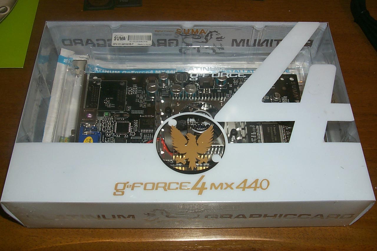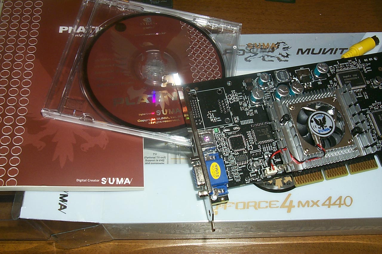 - SUMA Platinum GeForce4 MX 440 - на сегодня это самая разгоняемая карта из всех. Надо отметить еще и комплект поставки, который сам по себе визуально очень приятный, а также в нем имеется переходник S-Video-to-RCA.